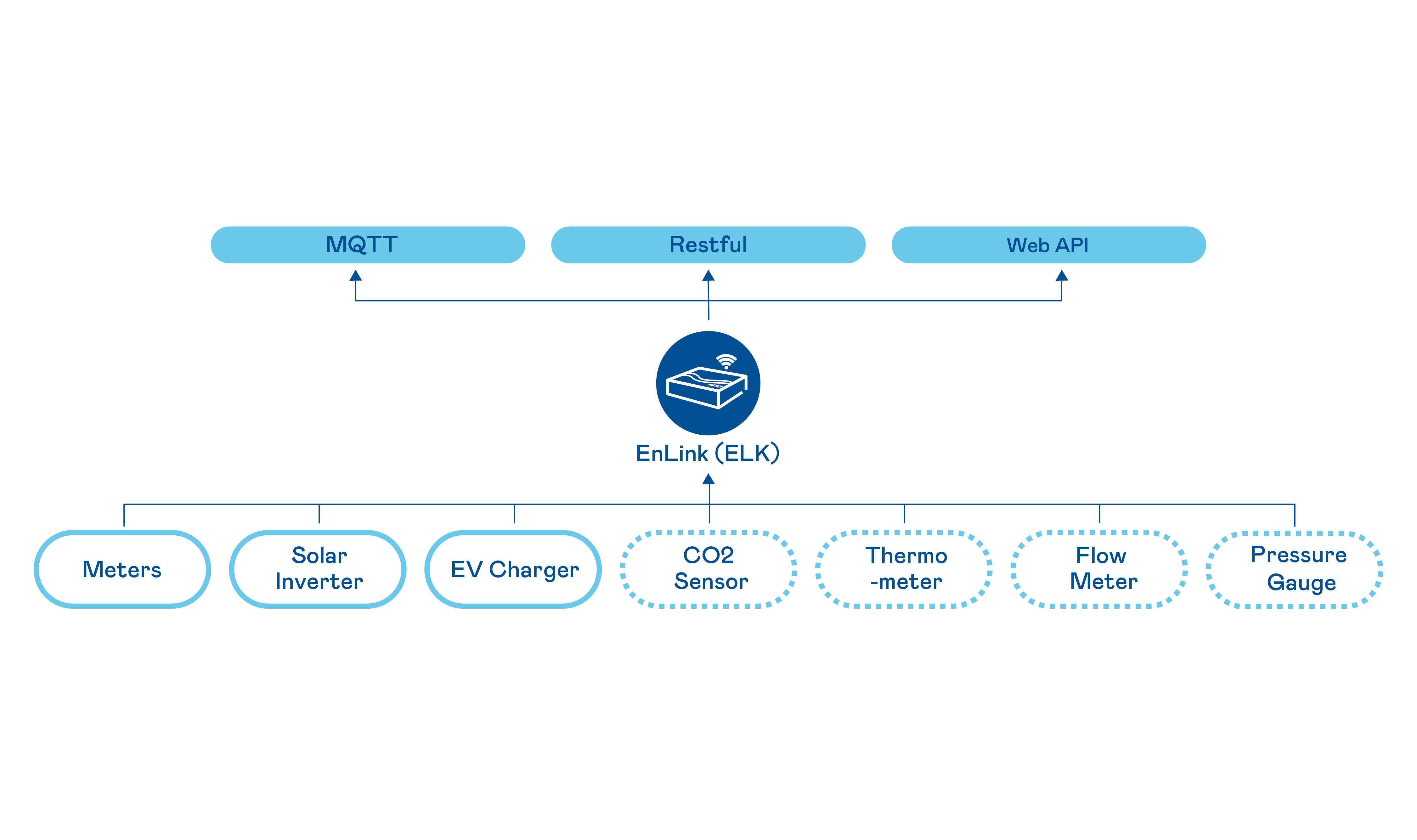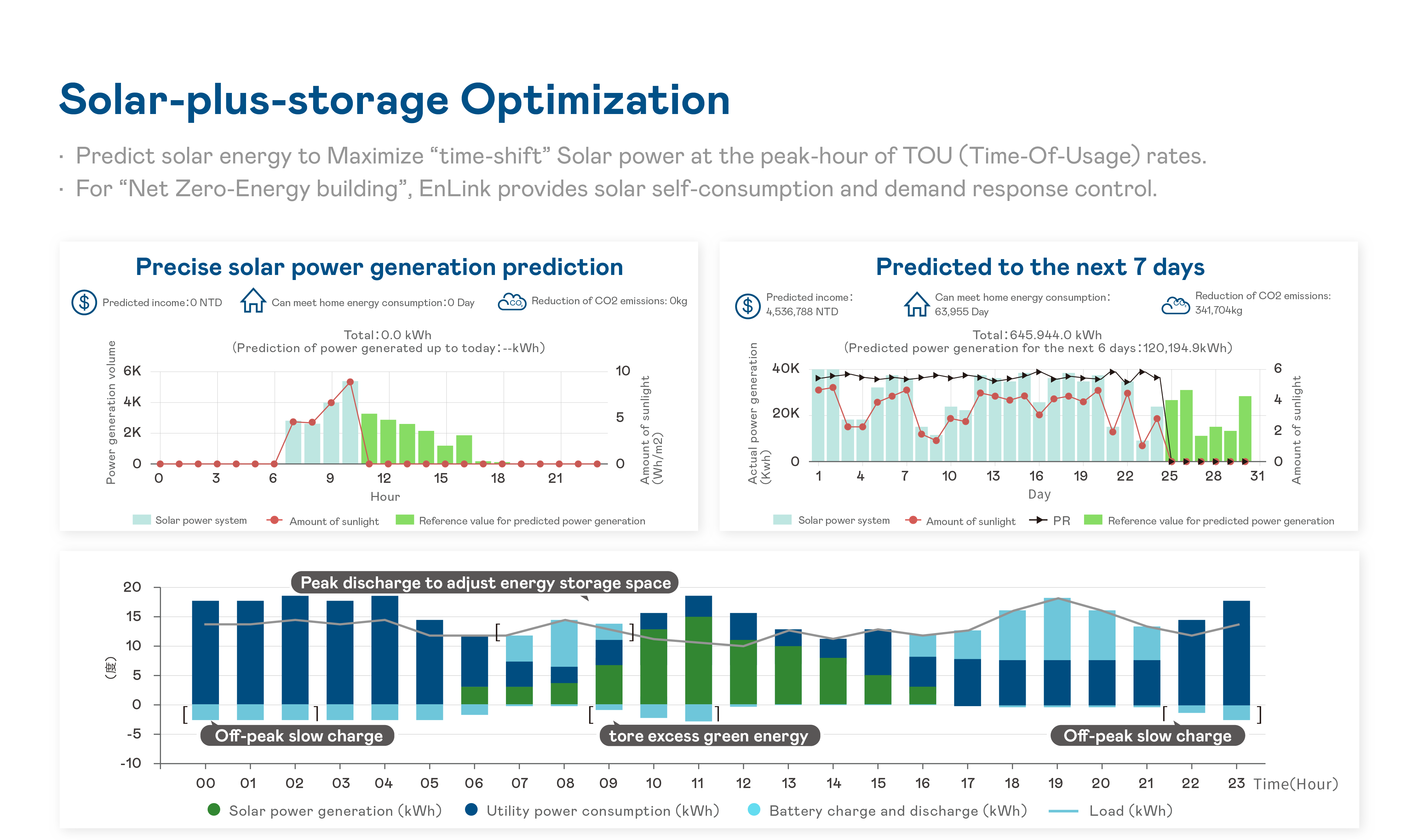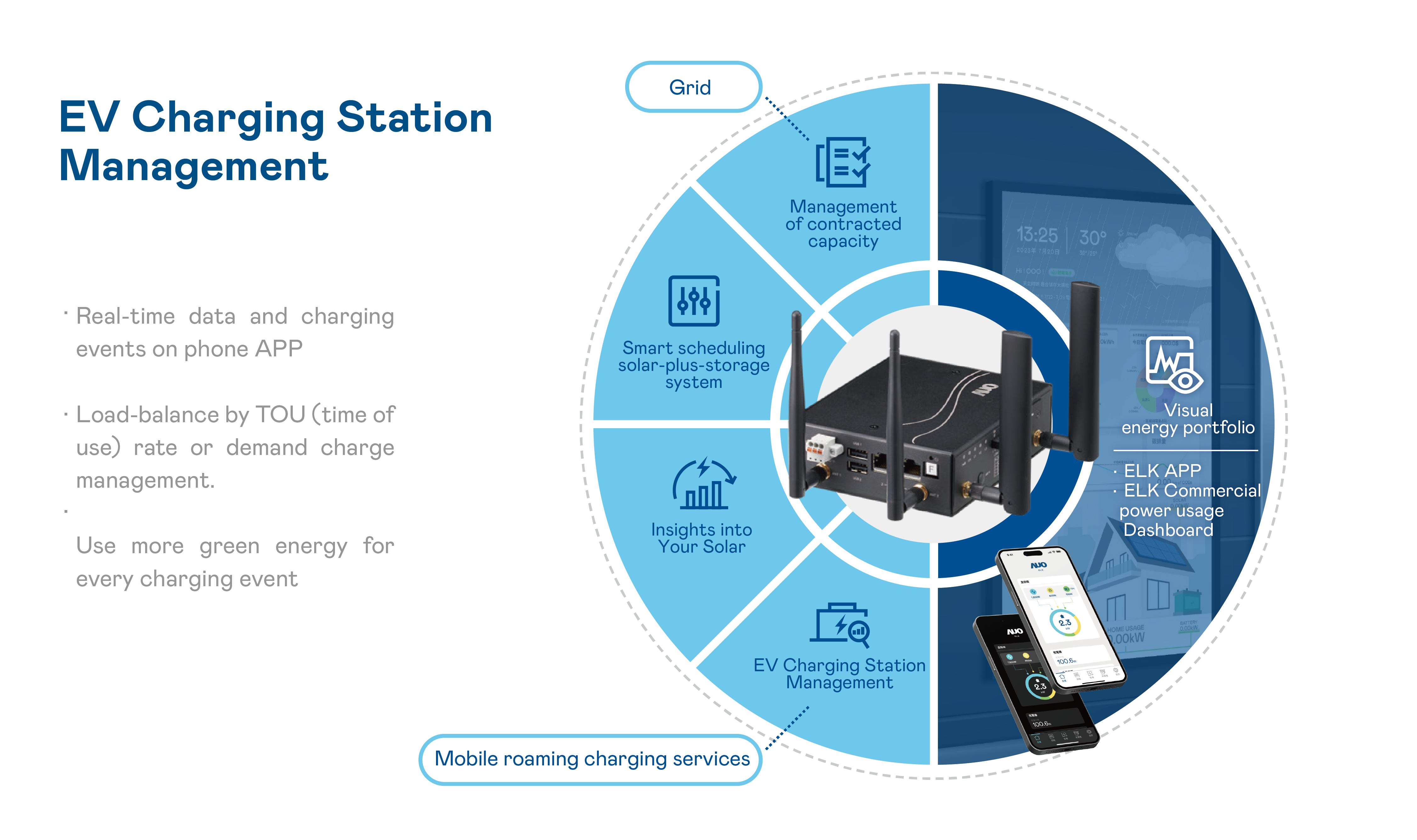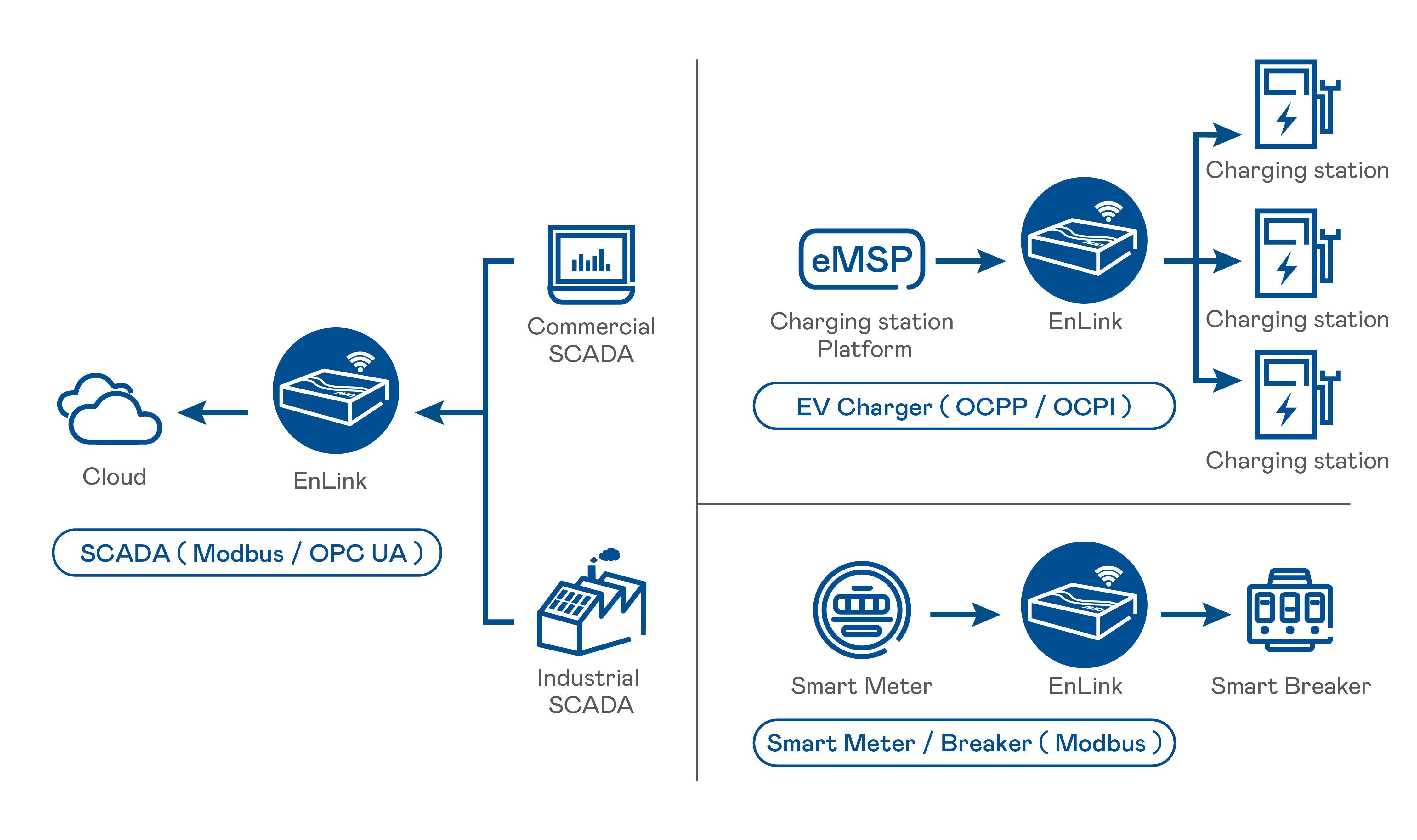 “EnLink” utilizes industrial-grade lightweight hardware equipped with powerful and versatile communication interfaces, including Modbus TCP/RTU and connectivity with sensors, smart circuit breakers, or energy storage devices. It standardizes the communication protocols for data collected from multiple endpoints and supports the 4G international standard communication protocol, enabling real-time uploads of energy-related information such as site energy consumption, grid power, and renewable energy output. Through the OCPP international standard communication protocol, it facilitates communication with various EV chargers. By integrating PV (photovoltaics) and ESS (energy storage systems), it achieves an automated energy management model for demand response and energy control in solar power generating, charging and storage scenarios.