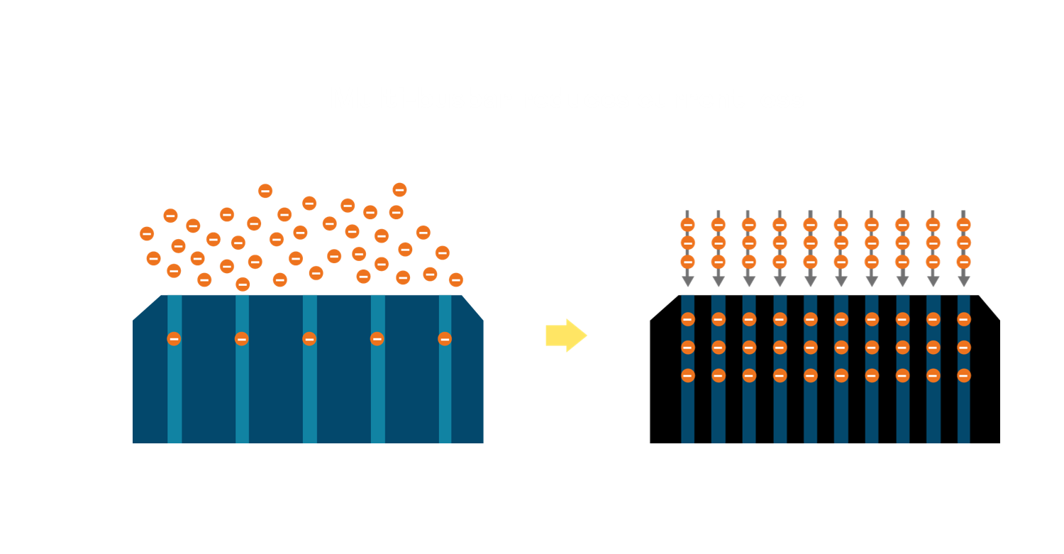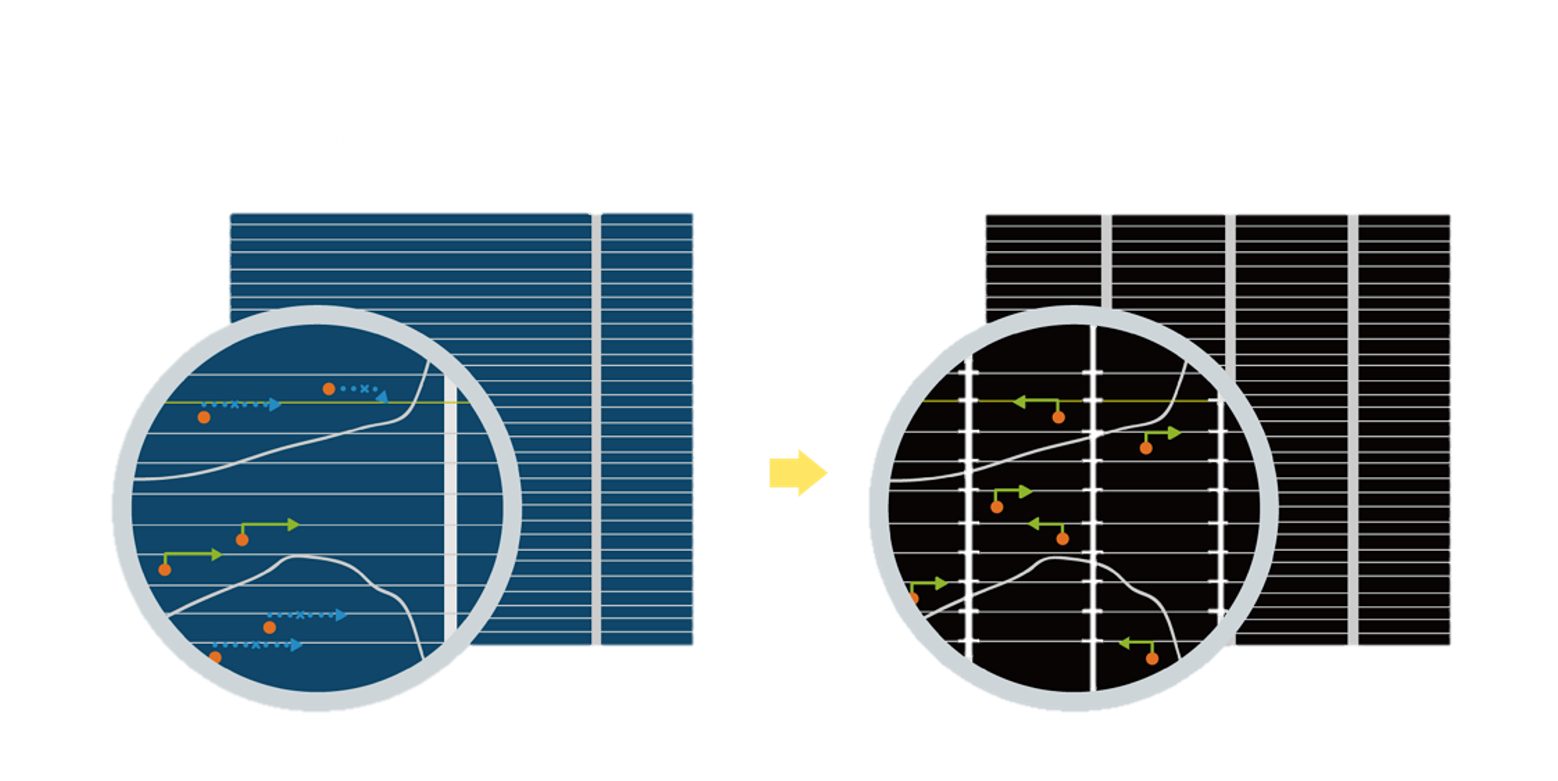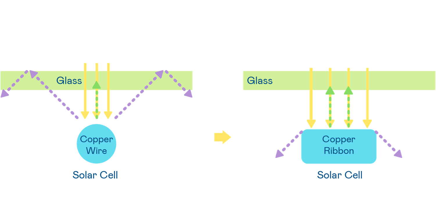 • 电池使用多条铜导线 (Copper wire) 于电池片上形成较短的电流路径,提高电流收集效率,接纳圆形设计的铜导线较传统扁平式的铜焊带 (Ribbon),可增加入射至电池的光线量。