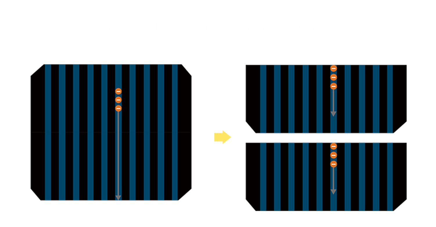 • 多条电极栅结构,可有效降低外力对于电池的影响,限制电池隐裂 (Micro-cracks) 规模,防止电流传输路径 (Current distribution) 之损坏进一步扩大。