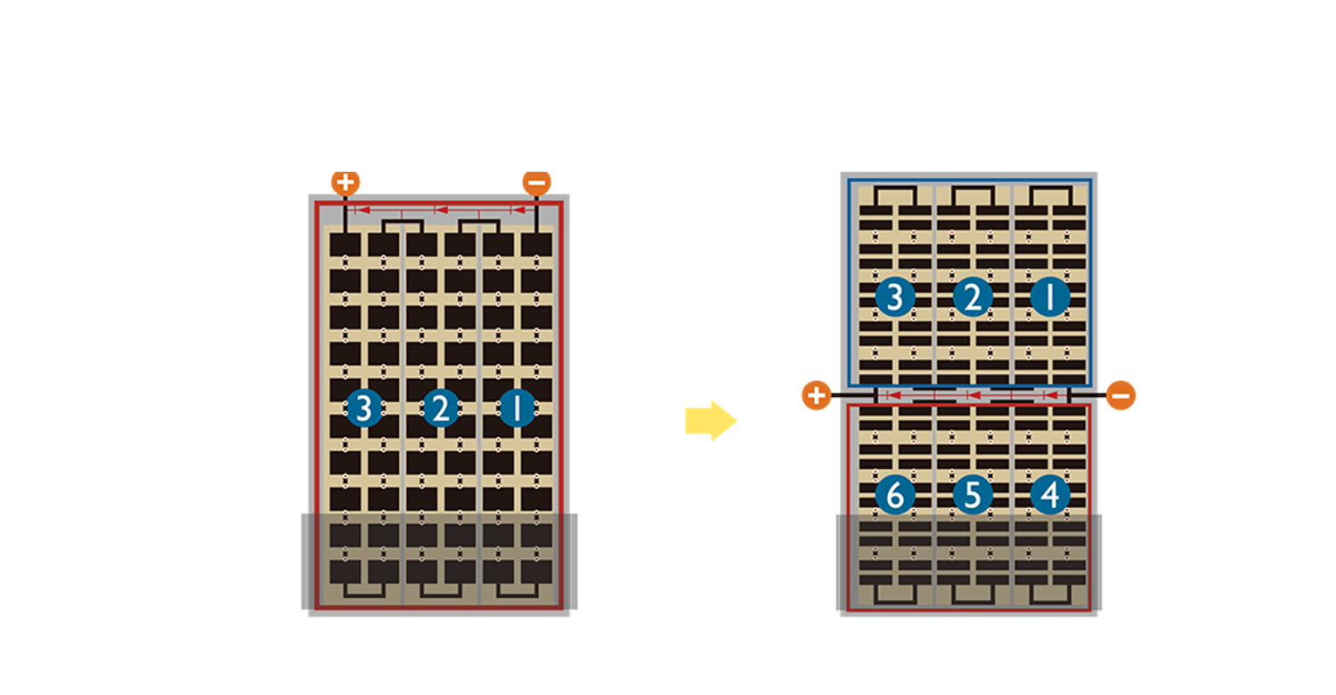 • 结合半切电池,降低遮阴影响、提升模组抗隐裂能力、并淘汰电阻损耗,进一步提升模组发电效能。
