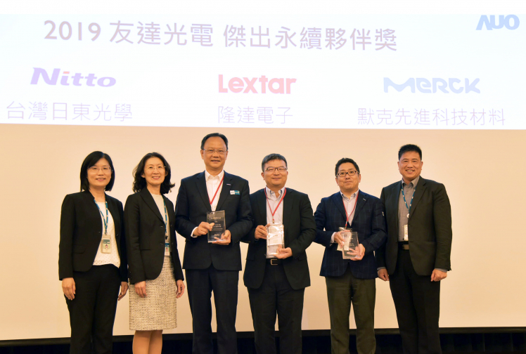 友達肯定供應商永續經營的優異表現,頒發傑出永續夥伴獎 (圖左到右:友達光電永續長古秀華、友達光電供應鏈總部資深協理吳宜芳、默克先進董事長謝志宏、隆達電子財務副總張博儀、台灣日東光學董事長塩見太、友達光電董事長暨執行長彭双浪)