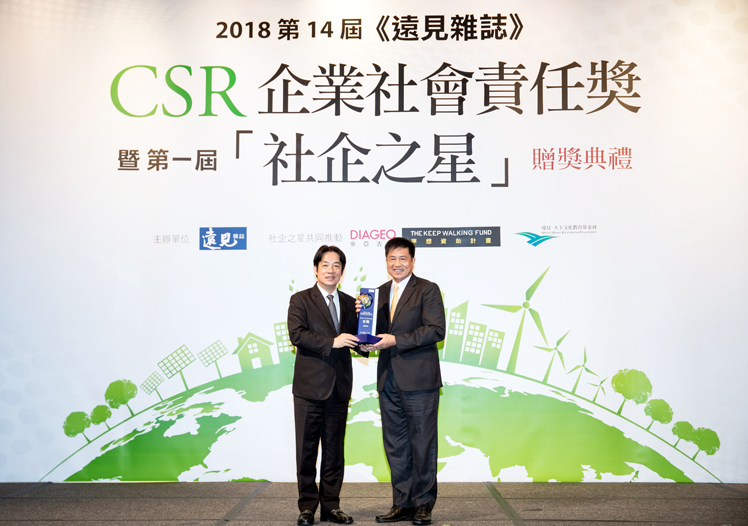友達光電獲 2018 遠見 CSR 三項大獎,為獲獎最多企業,行政院長賴清德頒獎 (左),友達光電董事長暨執行長彭双浪受獎(右)