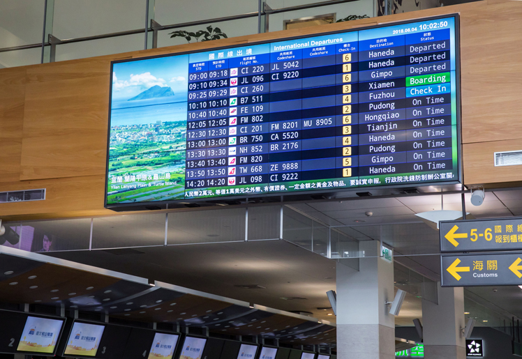 友達位於臺北松山機場的兩座拼接牆顯示器,各以 12 片 55 吋公共訊息顯示器所組成,具有高解析、低反射、極窄邊框的搶眼設計。極窄邊框拼接技術讓相鄰螢幕拼接後的邊框寬度僅 1.8mm,近乎無接縫的觀看視野搭配獨家色彩及亮度調校技術呈現完美的畫面均勻度,可讓旅客視覺跳脫螢幕邊框聚焦於整體影像內容,打造陶醉式觀賞體驗,呈現航班資訊的同時也為廣告主創造最佳宣傳效益。此外針對機場等大型公共工程對於品質、耐用度的高度要求,整合卓越的影像顯示技術及區域調光低耗能設計,長時間播放仍可實現絕佳的耐用度和視覺效果。