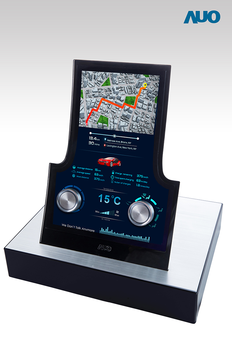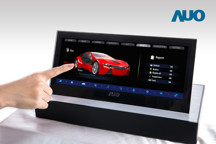 高性能異型切割車用面板展現高可靠度及彈性設計優勢 友達近年來全力投入高性能車用面板的開發,以因應智慧車發展趨勢。中控台應用方面,友達領先全球推 出 (*) 13.2 吋異型切割面板,具有 1200x1600 高解析度、NTSC 85% 高色彩飽和度及 1000nits 高亮度,並改於顯示區域設計閘極電路,以於面板側邊釋出空間做異型切割。同時顯示區域亦特別設計對稱的孔位可安裝按鍵或旋鈕,創造更多設計彈性。